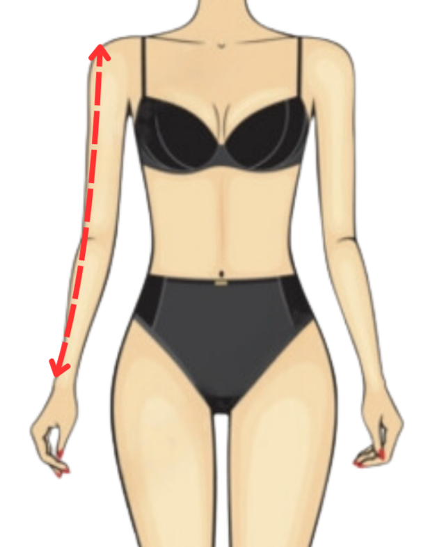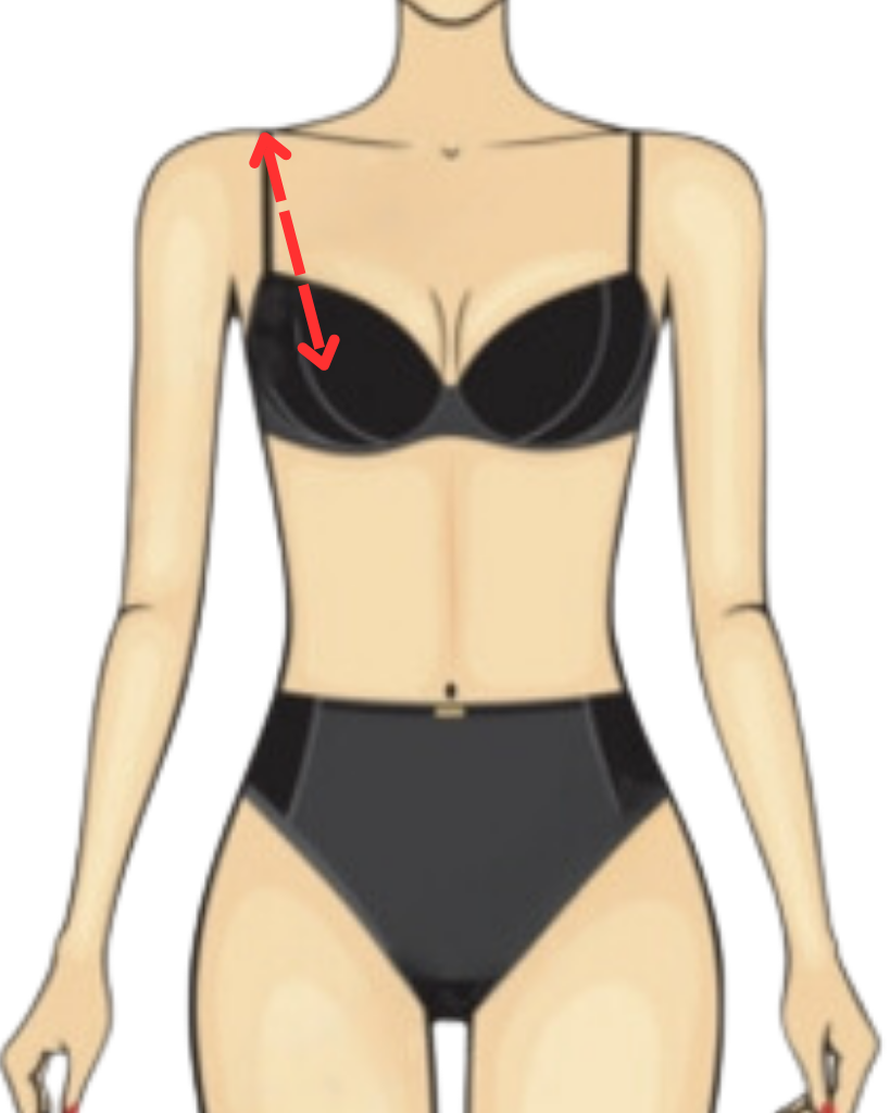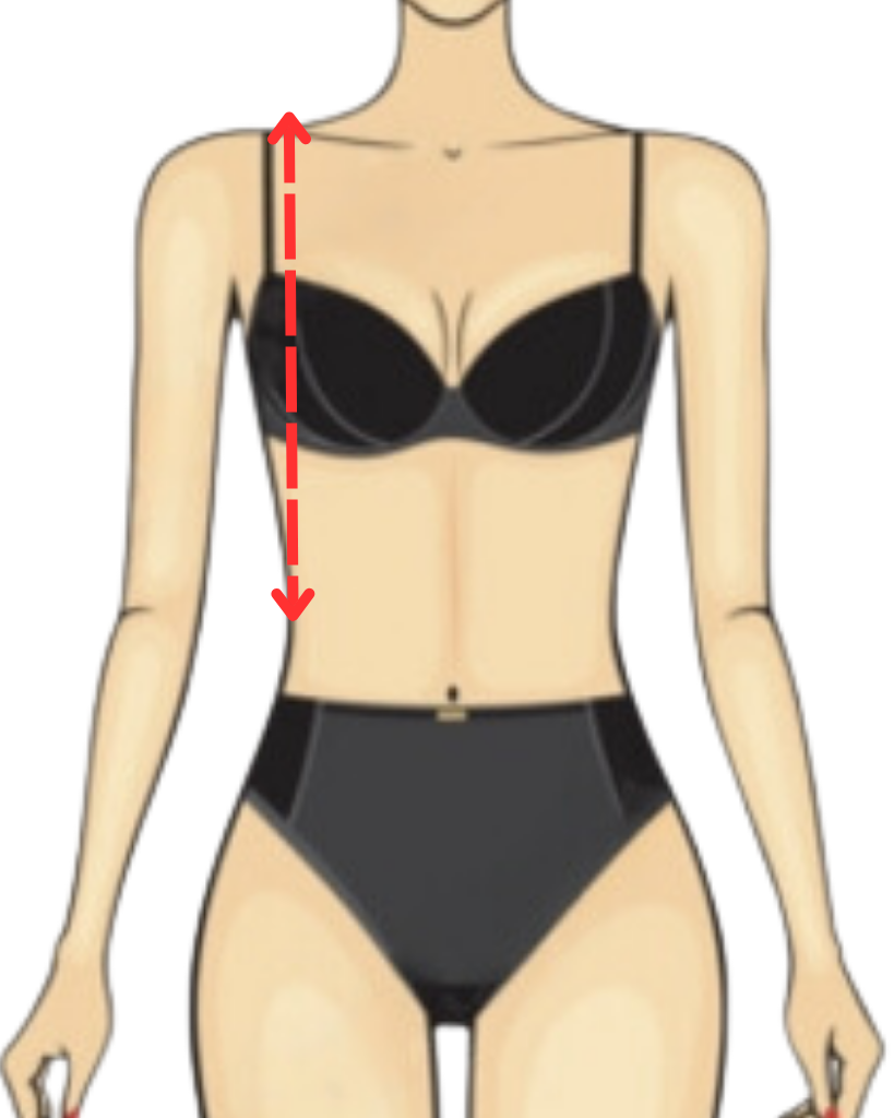 Measure from the middle of your single shoulder, go down over your nipple to the waist. Keep tape vertical to the floor.