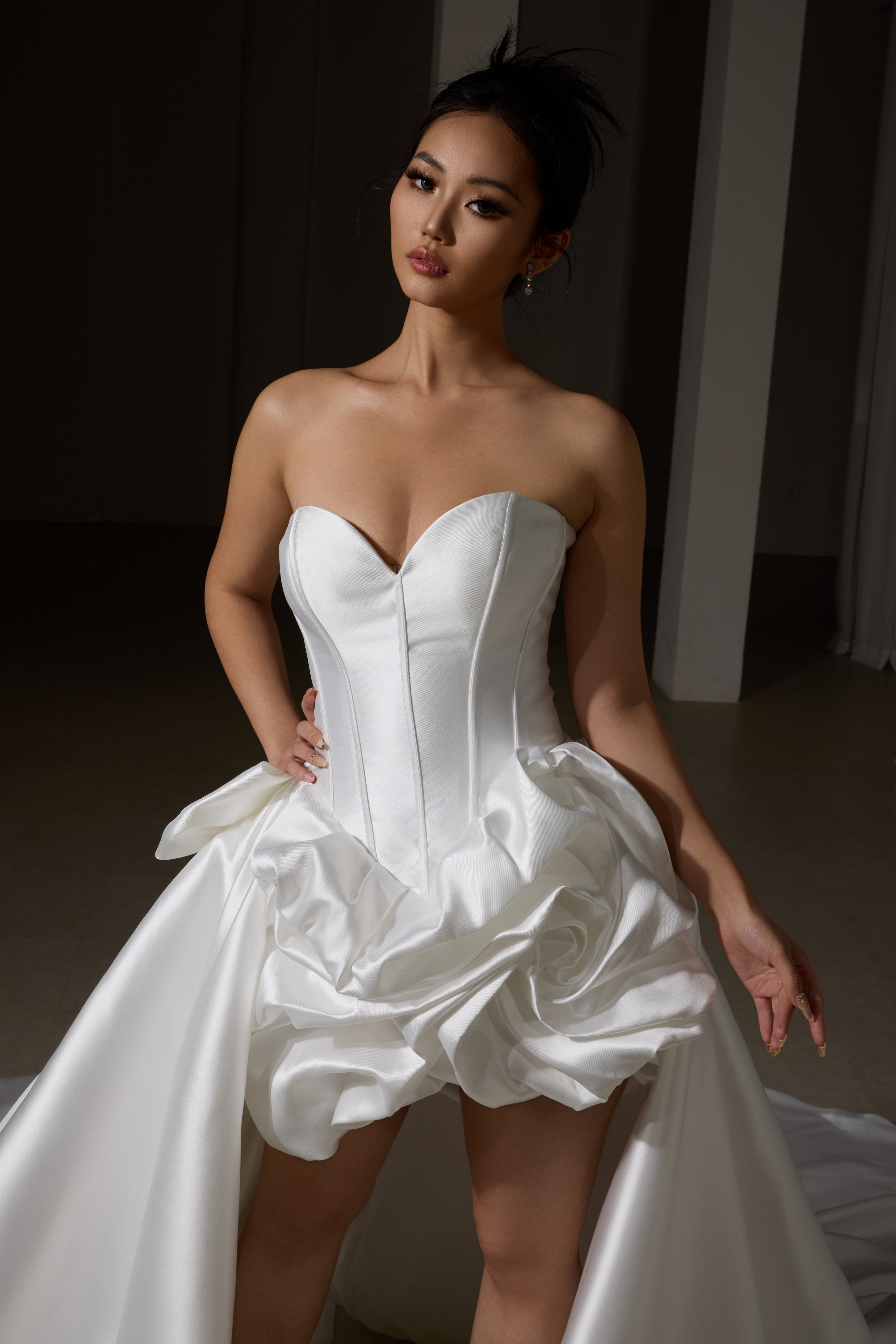 Make a dramatic statement with our ROSETTE open-front overskirt, where classic elegance meets modern sophistication. This show-stopping piece features an architectural rose-inspired gathering that creates a breathtaking sculptural effect, perfect for the bride who dares to