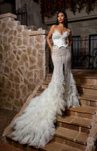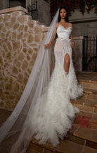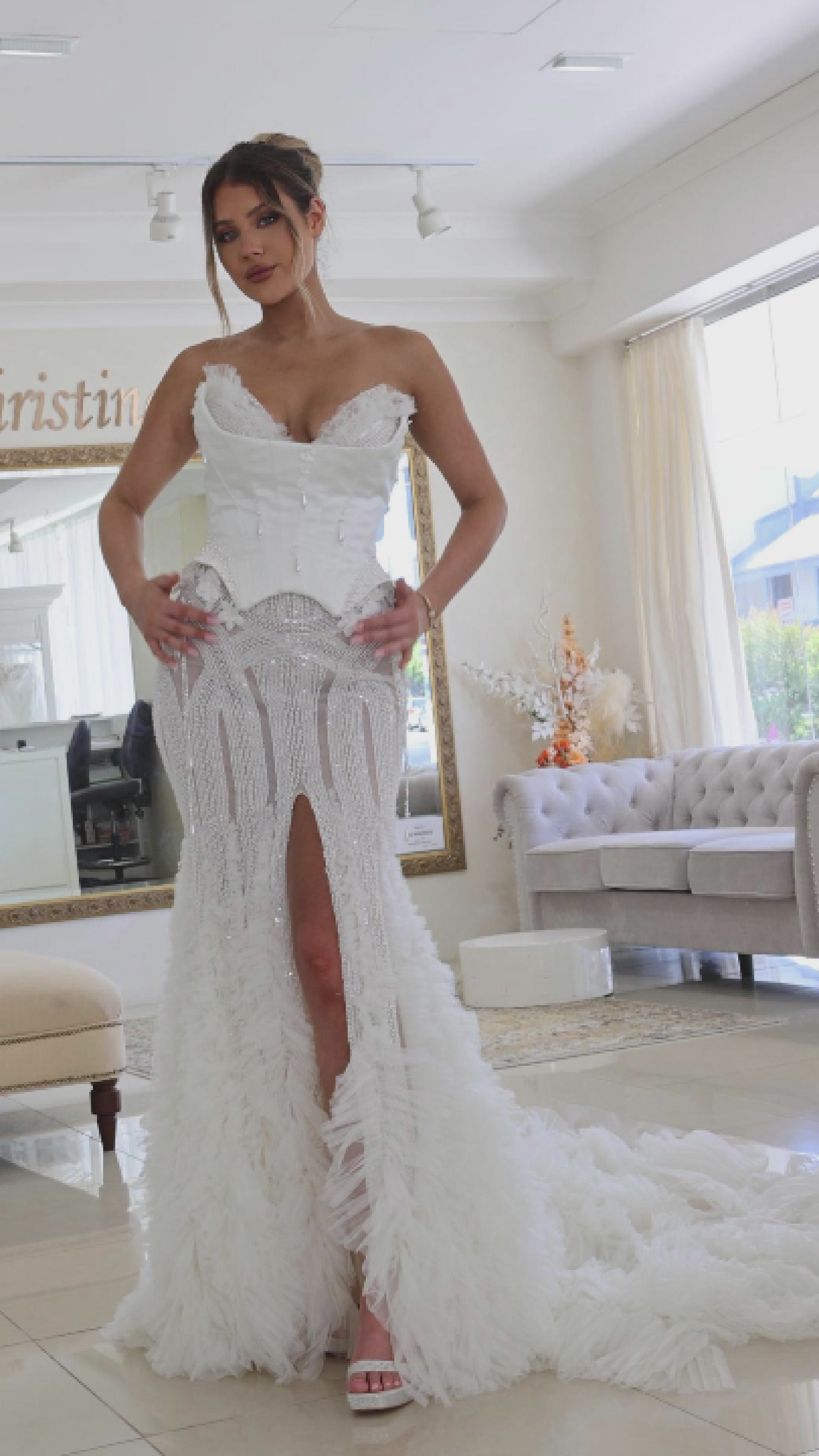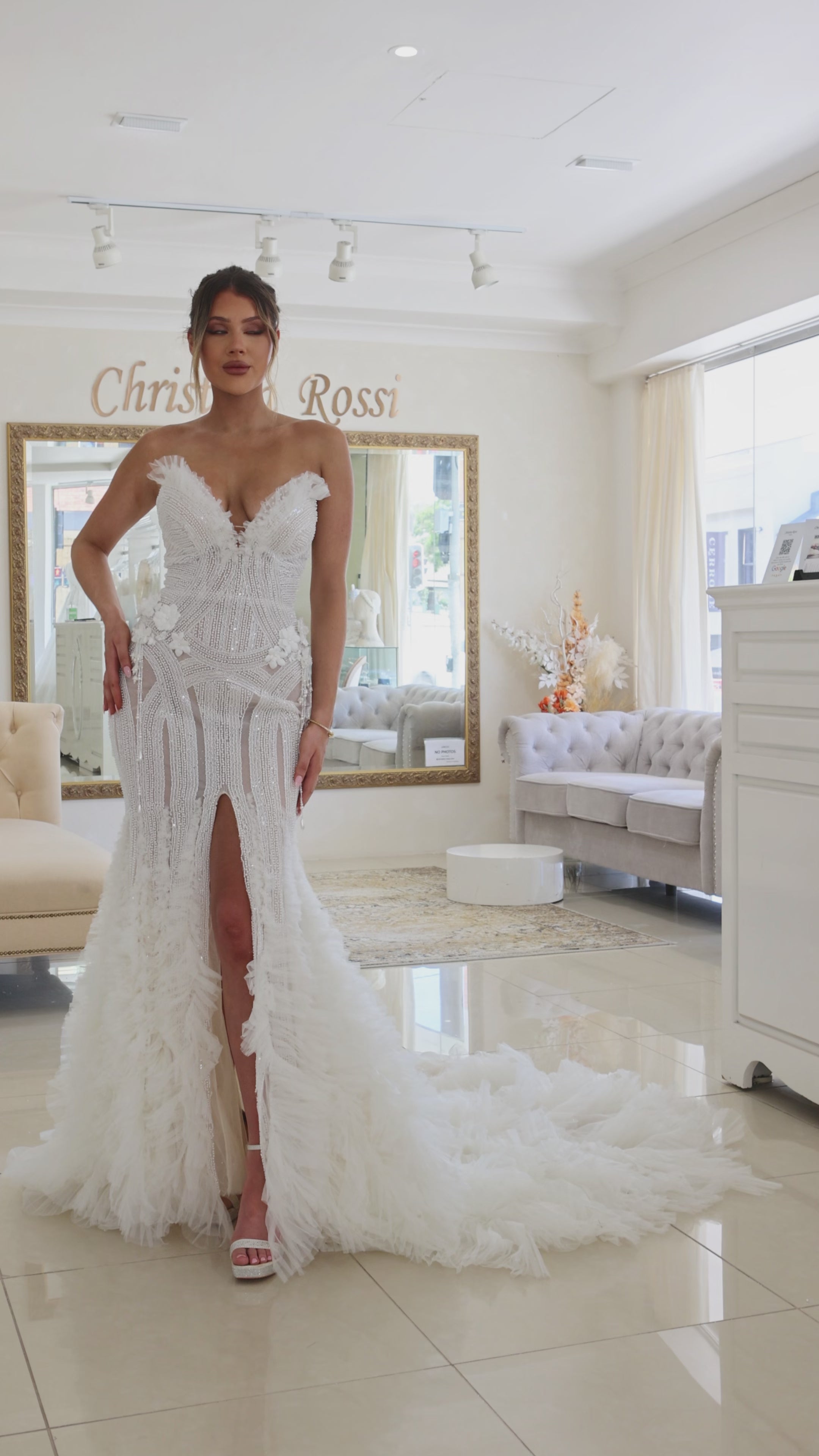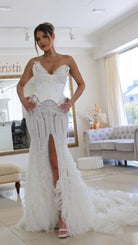 Splendid lace and tulle detachable corset entirely adorned by hand with crystal, pearls, 3D florals, and sequined embellishments that fold into mesmerizing waves ornament. Featuring a sexy slit in the middle of the skirt, an impressive waist detail, a lace closure on the back. Can be complemented by a matching minimalist or matching veil.