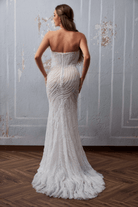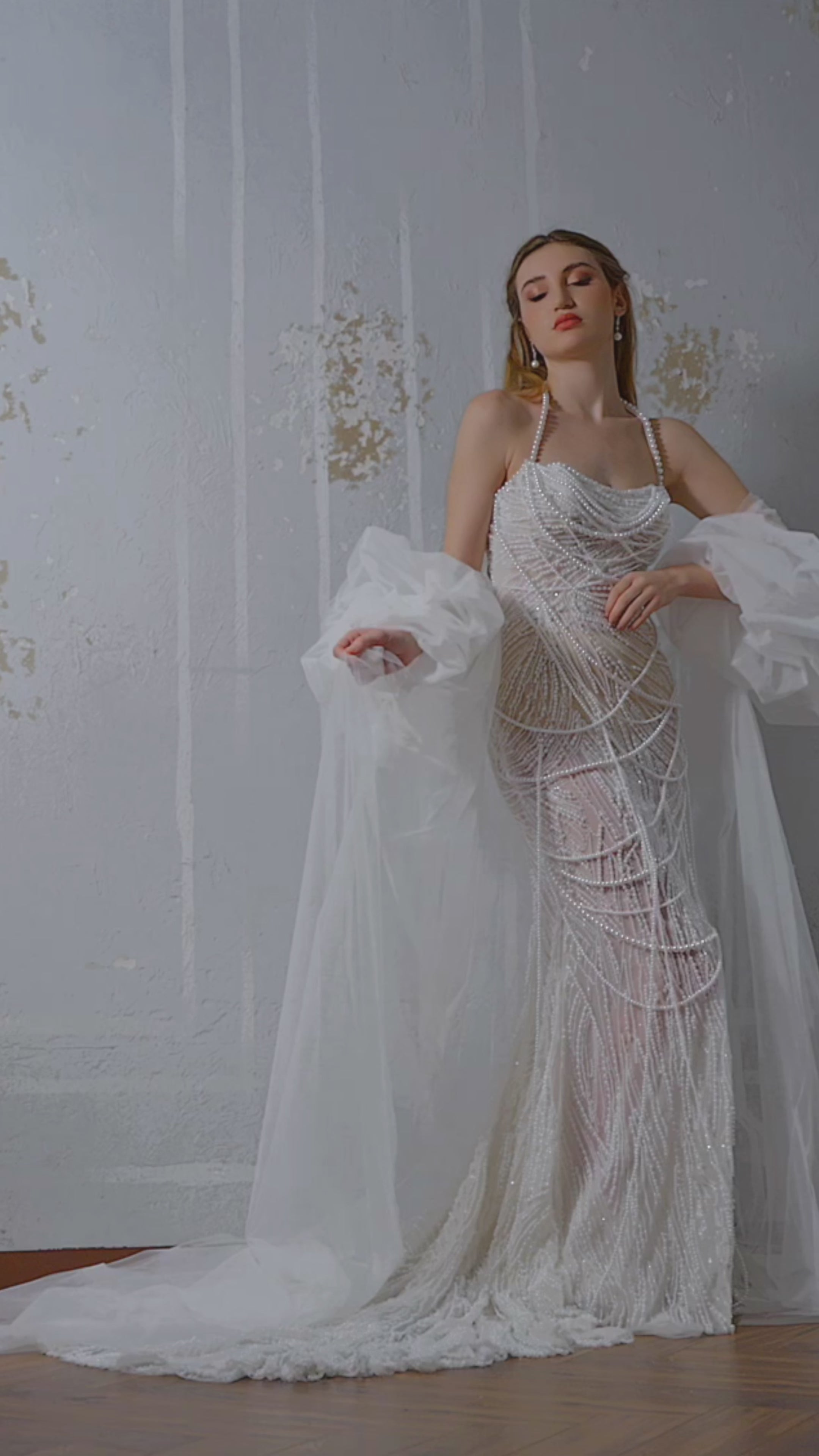 Exquisite fitted wedding gown made of hand-embellished pearls and dainty beading throughout the entire fitted silhouette exuding fluidity and movement from head to toe. Featuring a halter neckline, build-in cups, corset and boning for support, a body-hugging design for a sexy hint, and a semi-open back secured by zipper with buttons closure. The shimmering sparkles beautifully enhance the lace ornament that flows effortlessly across the gown. Available with an ivory or nude slip dress for more coverage.