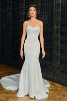 Modern style, lightweight fabric of satin, fit & flare wedding gown with a long detachable train.
