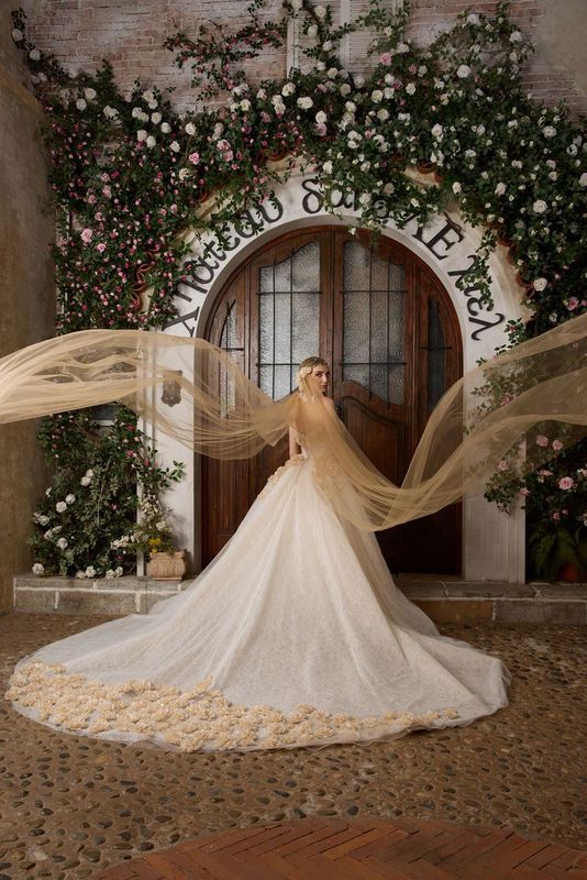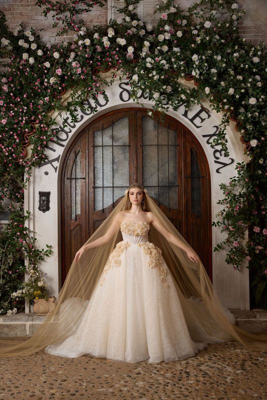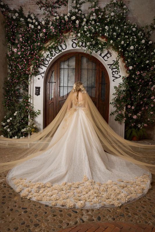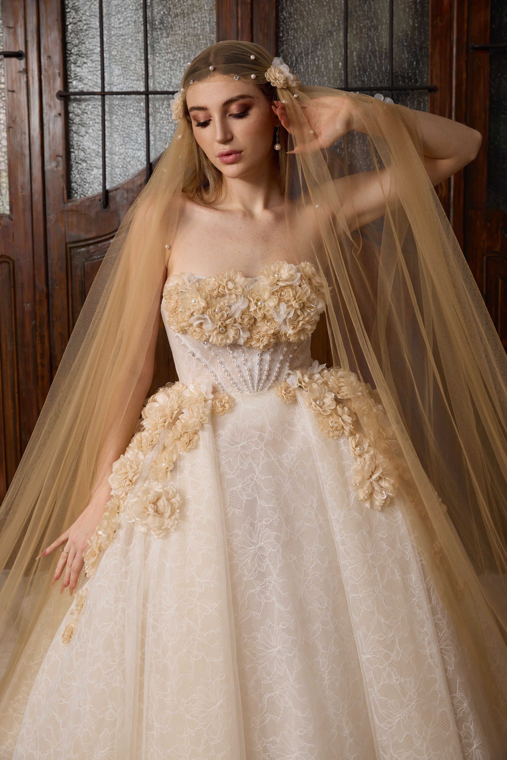 Step into your fairytale with our ethereal Lafee cathedral veil in enchanting champagne tulle. Designed for the bride who dreams of classic romance with a modern twist, this open-front masterpiece adds a golden-hour glow to your bridal ensemble.