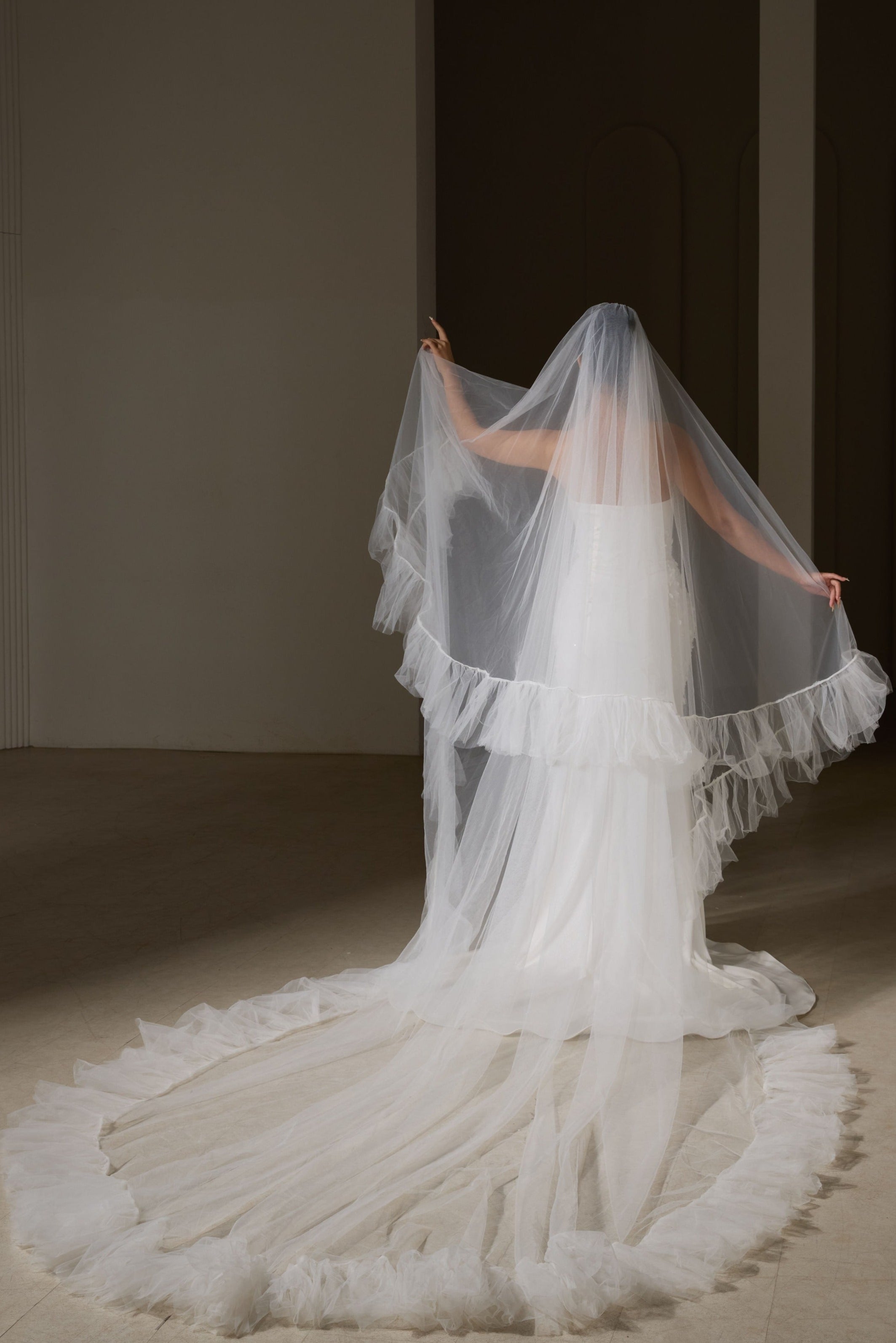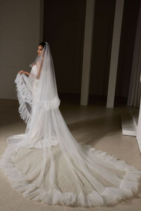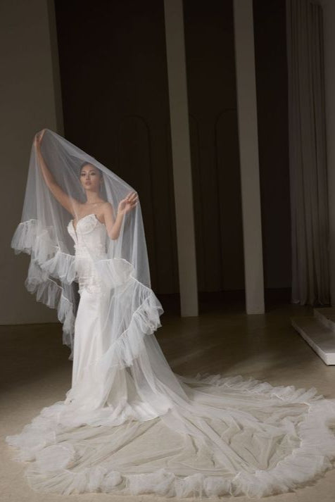 Command attention with our show-stopping cathedral-length open front veil. Featuring an exquisite horsehair trim that creates spectacular volume and movement, this masterpiece trails dramatically behind you with over 3 metres of ethereal elegance.The delicate tulle cascades from a discreet comb, creating a magnificent silhouette that's both timeless and fashion-forward.