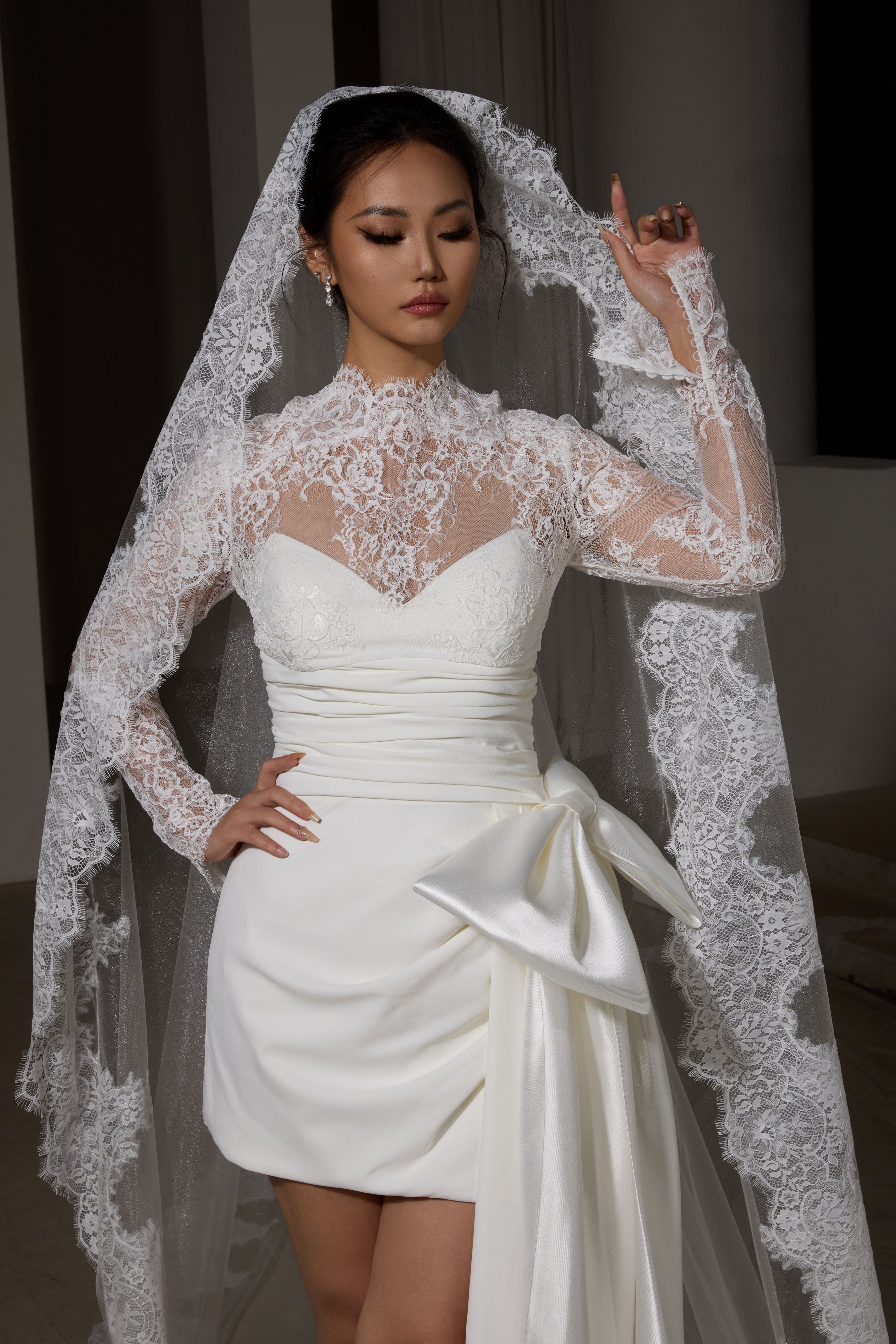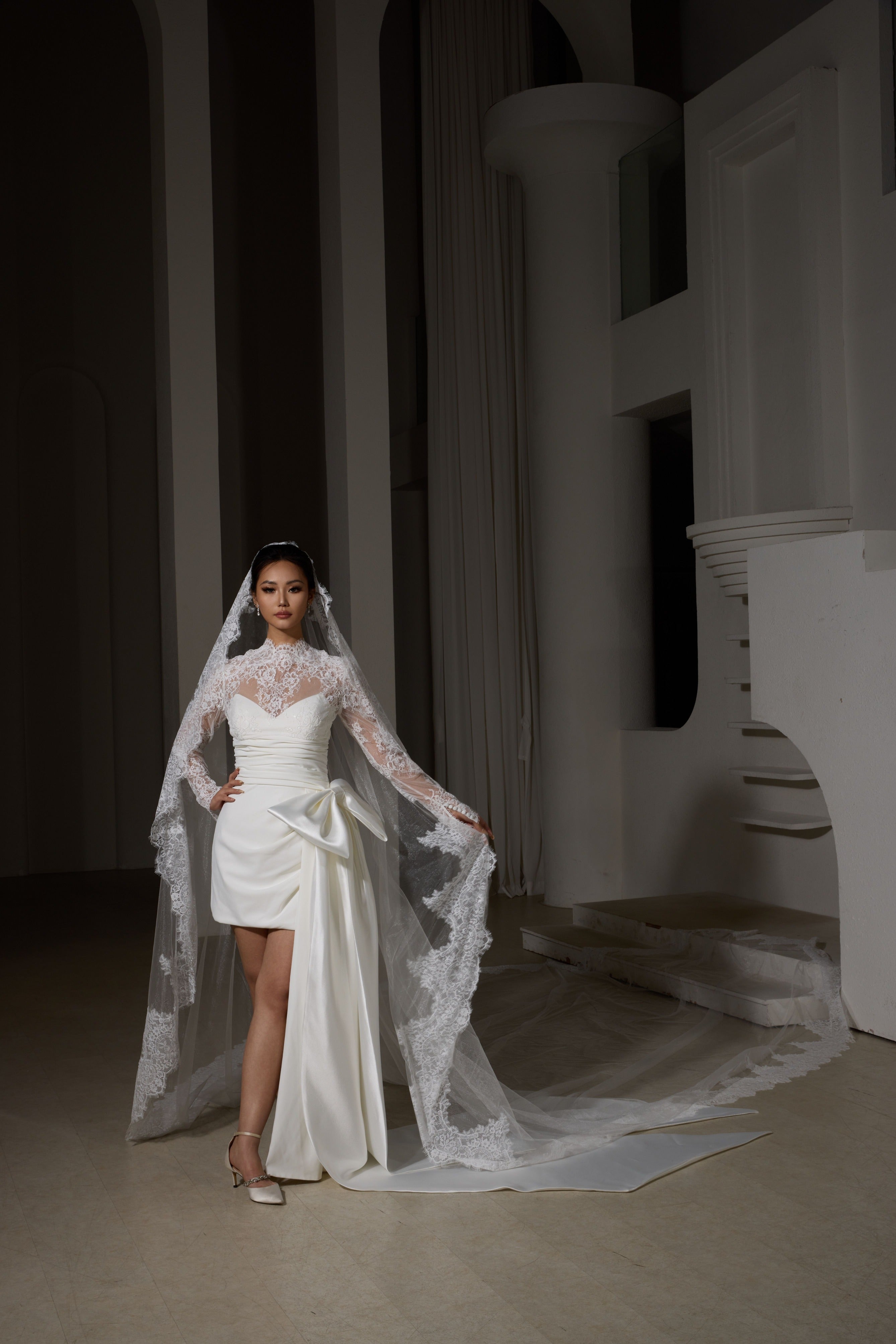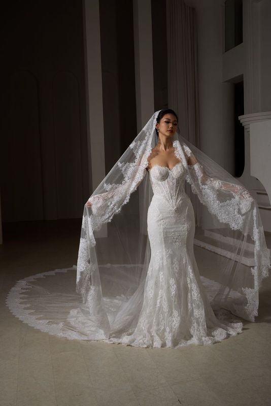 This breathtaking veil features exquisite French lace appliqués that frame your silhouette with ethereal elegance, creating a truly regal bridal moment.